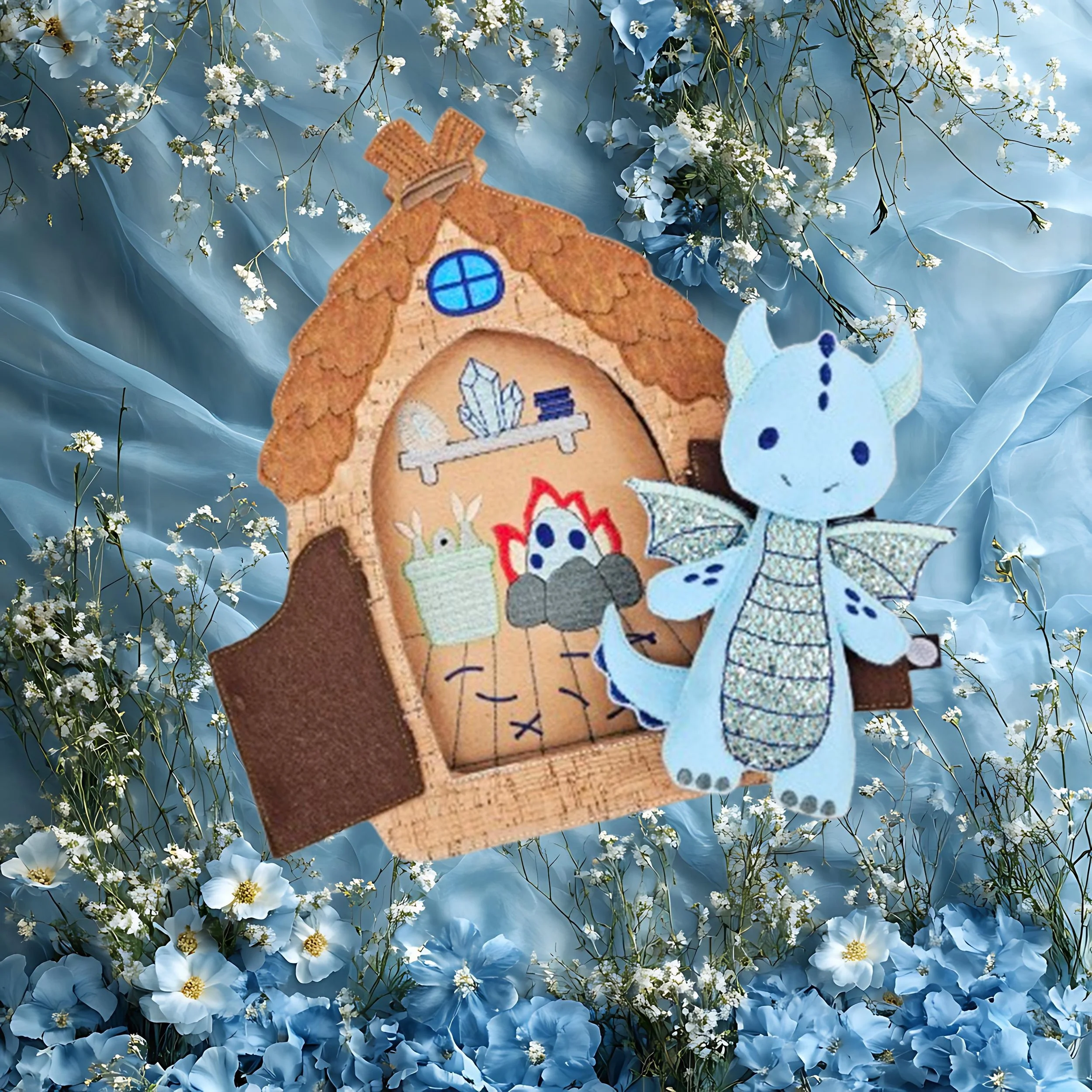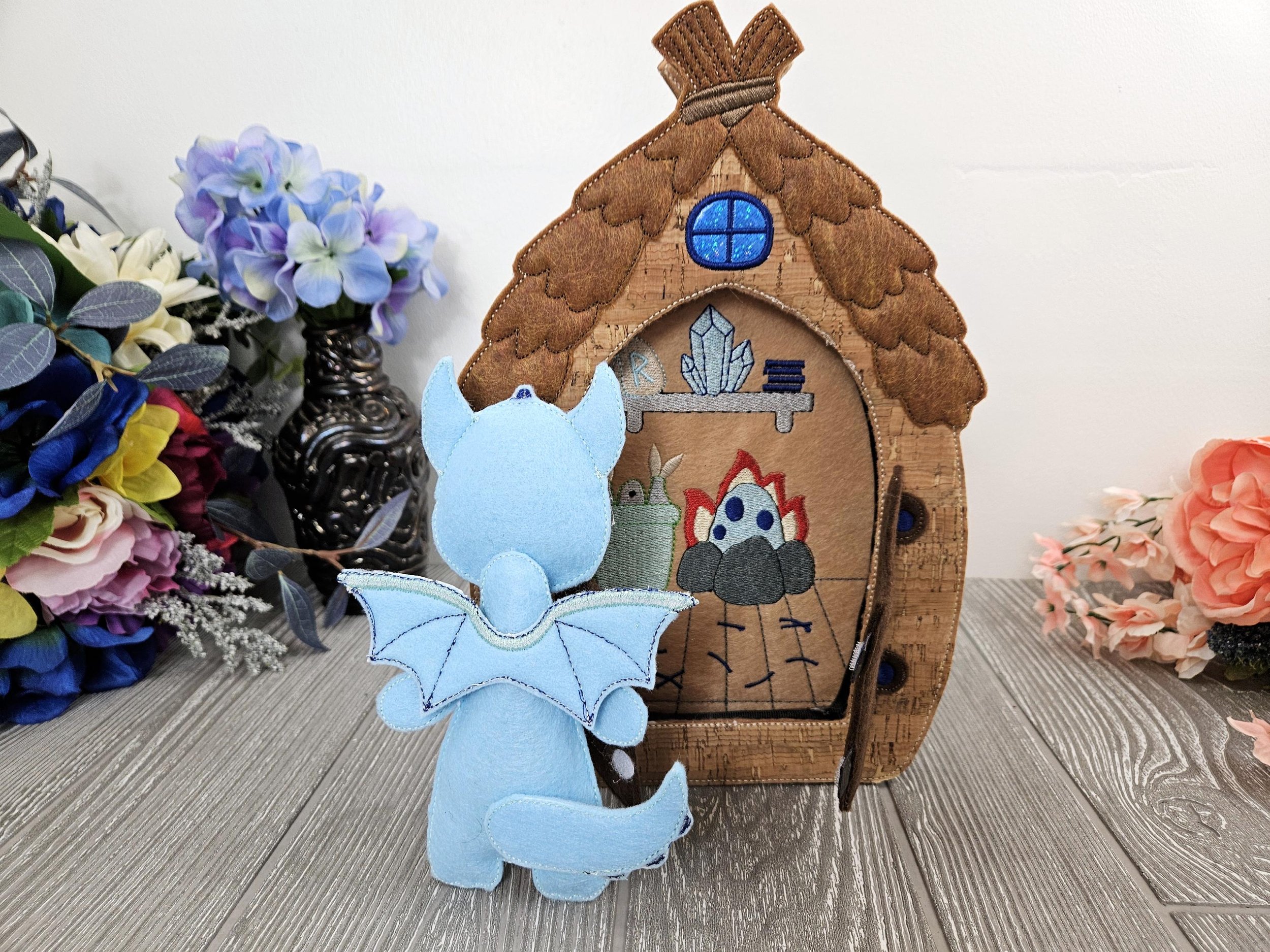 Discover the enchanting world of imagination with our delightful Dragon Stable, crafted from high-quality faux leather and soft felt. This charming set features a whimsical blue dragon adorned with glitter vinyl accents, making it a captivating addition to any playroom or collection. The stable's doors open wide, allowing for easy access to your dragon, whether it's nestled inside or soaring outside for adventures.
