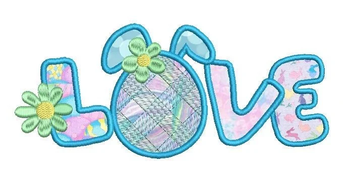 ** The Easter Plaid Love applique is a digital download product that does not come in a physical form. It is designed to be used with an embroidery machine, which is not included with the purchase. The applique file measures approximately 7.0" x 3.0".